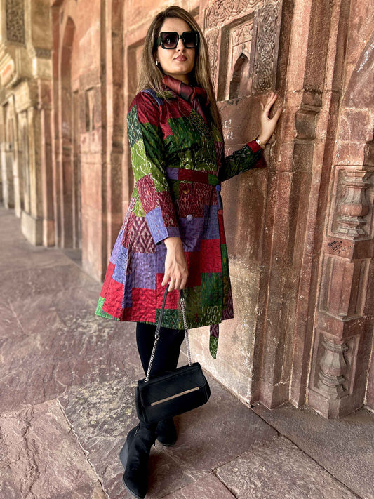AMELIA VERMONT AUTUMN PATOLA SILK PATCHWORK KANTHA TRENCH COAT