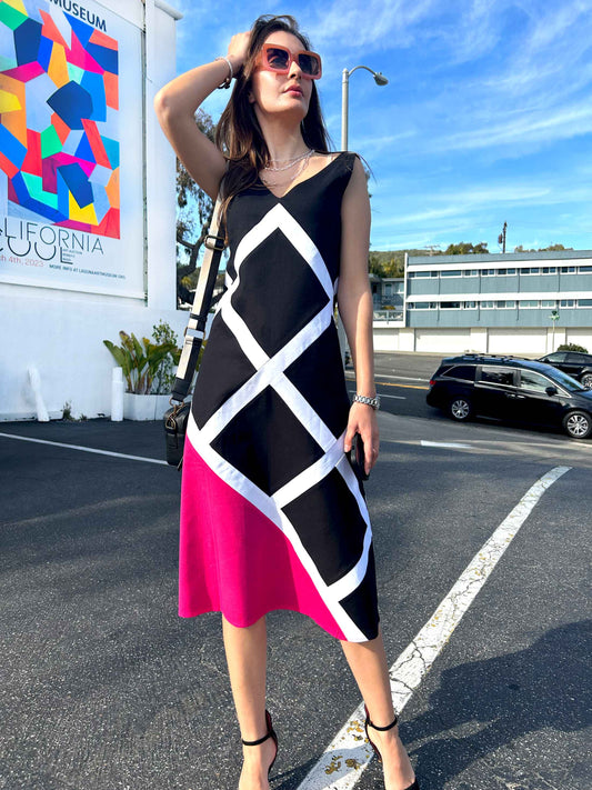MELODY CALIFORNIA COLORS MONDRIAN HAND WOVEN COTTON PATCHWORK DRESS