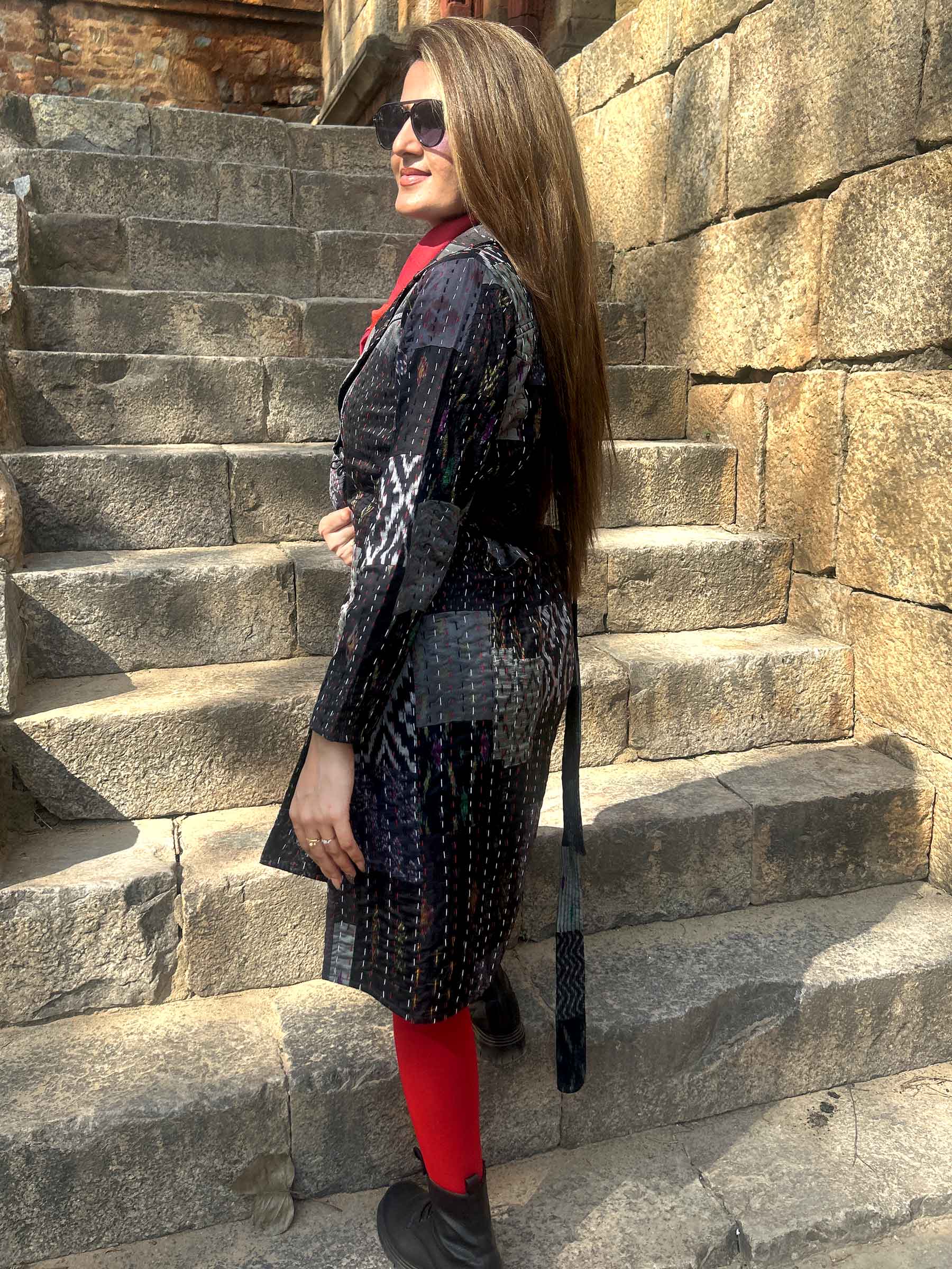 Part of the ‘Vermont Autumn Collection’, this trench coat made with patches of Patola Silk Sarees is inspired by the shades of gray seen in late Autumn. The rectangular patches are attached together and stitched using ‘Kantha Stitching Technique’ to give it a glamorous look.