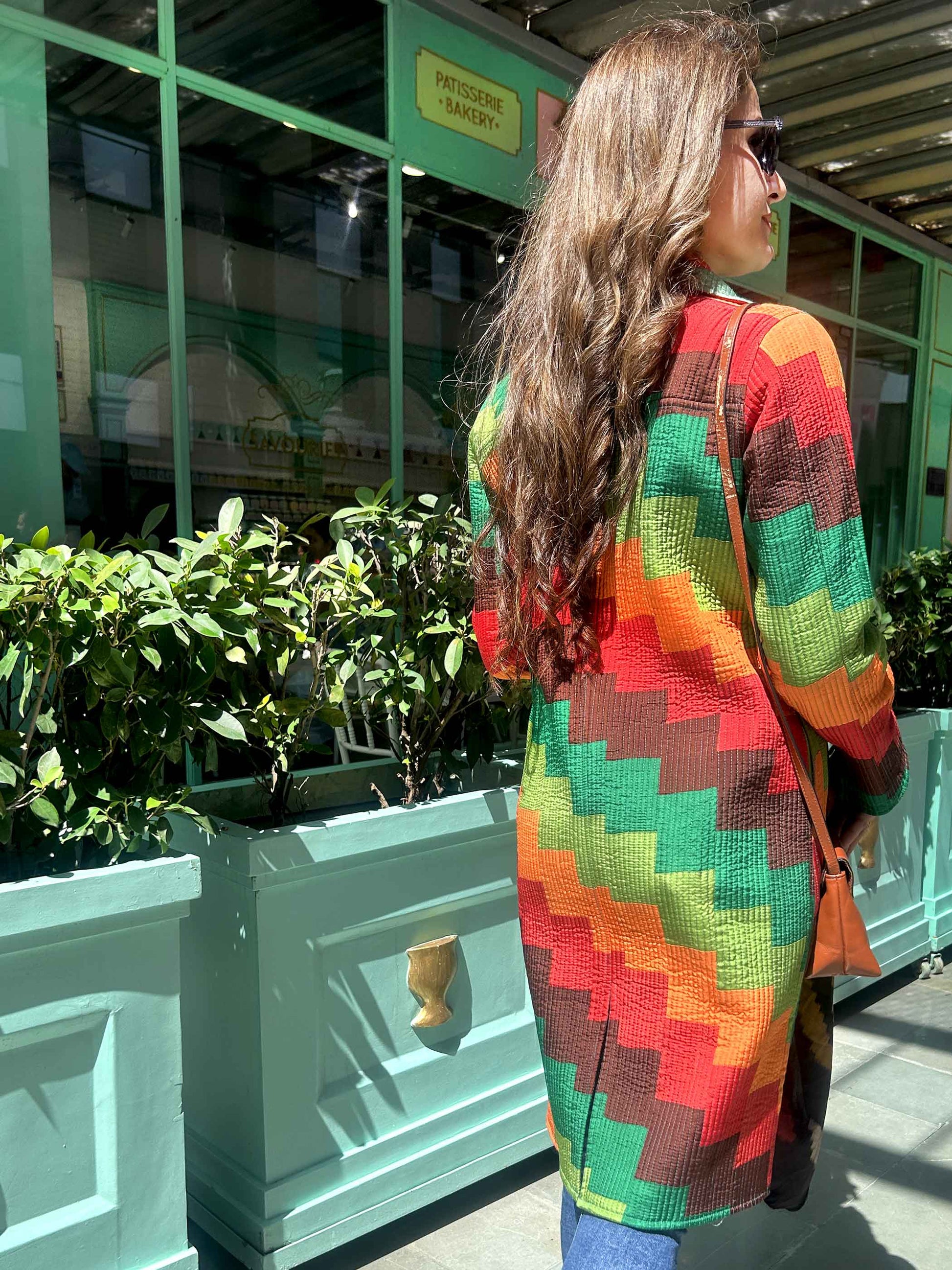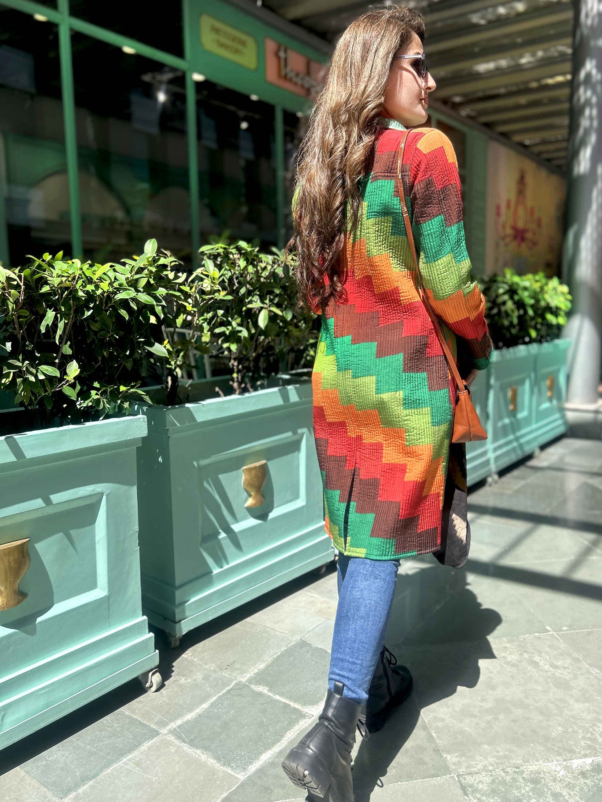 Part of the āVermont Autumn Collectionā, this quilted jacket made with patches of Pure Silk is colors seen everywhere in nature ā green, orange, red, brown. The patches are attached together in a diagonal pattern and quilted in a straight lines to give it a glamorous look.