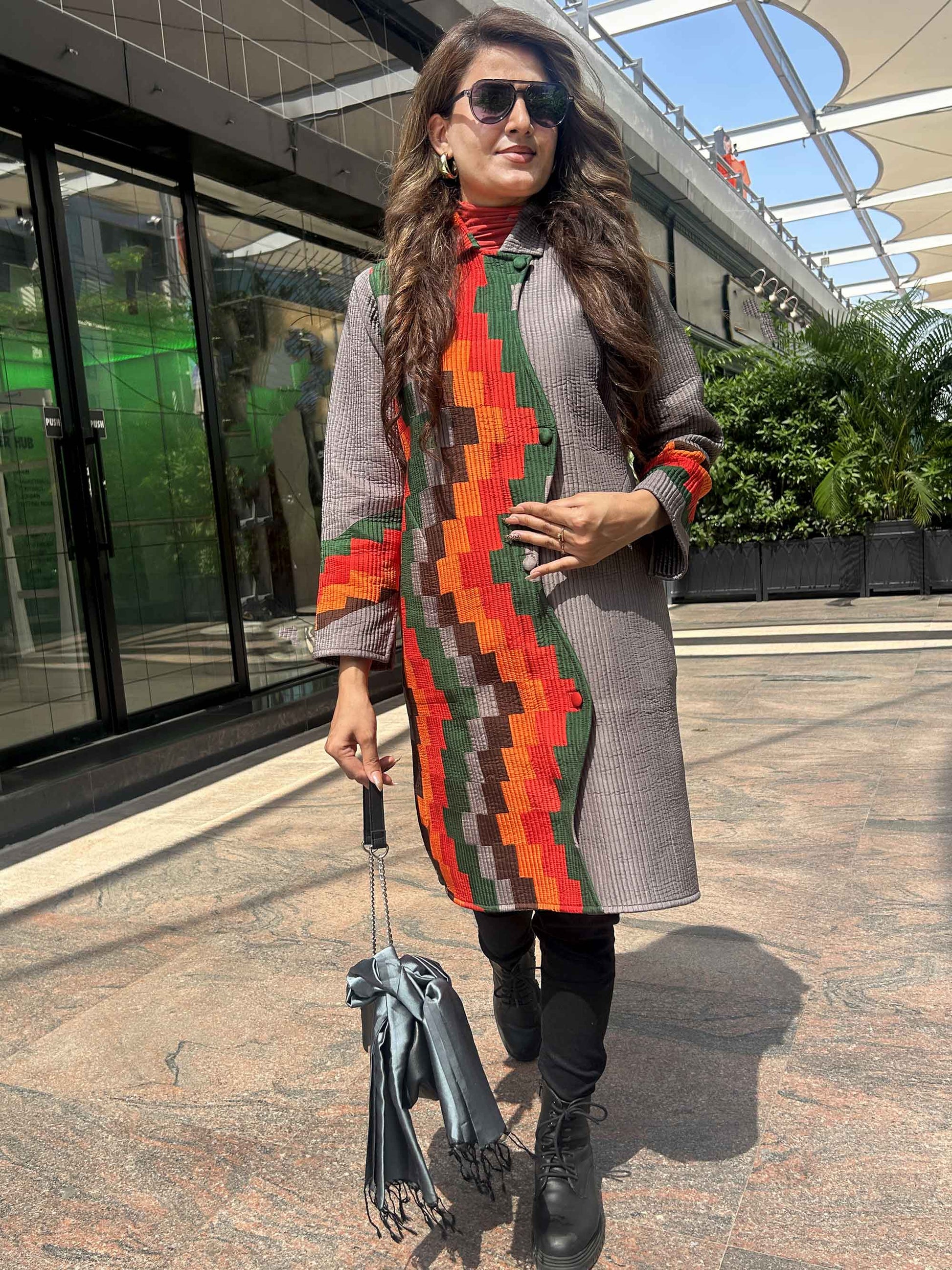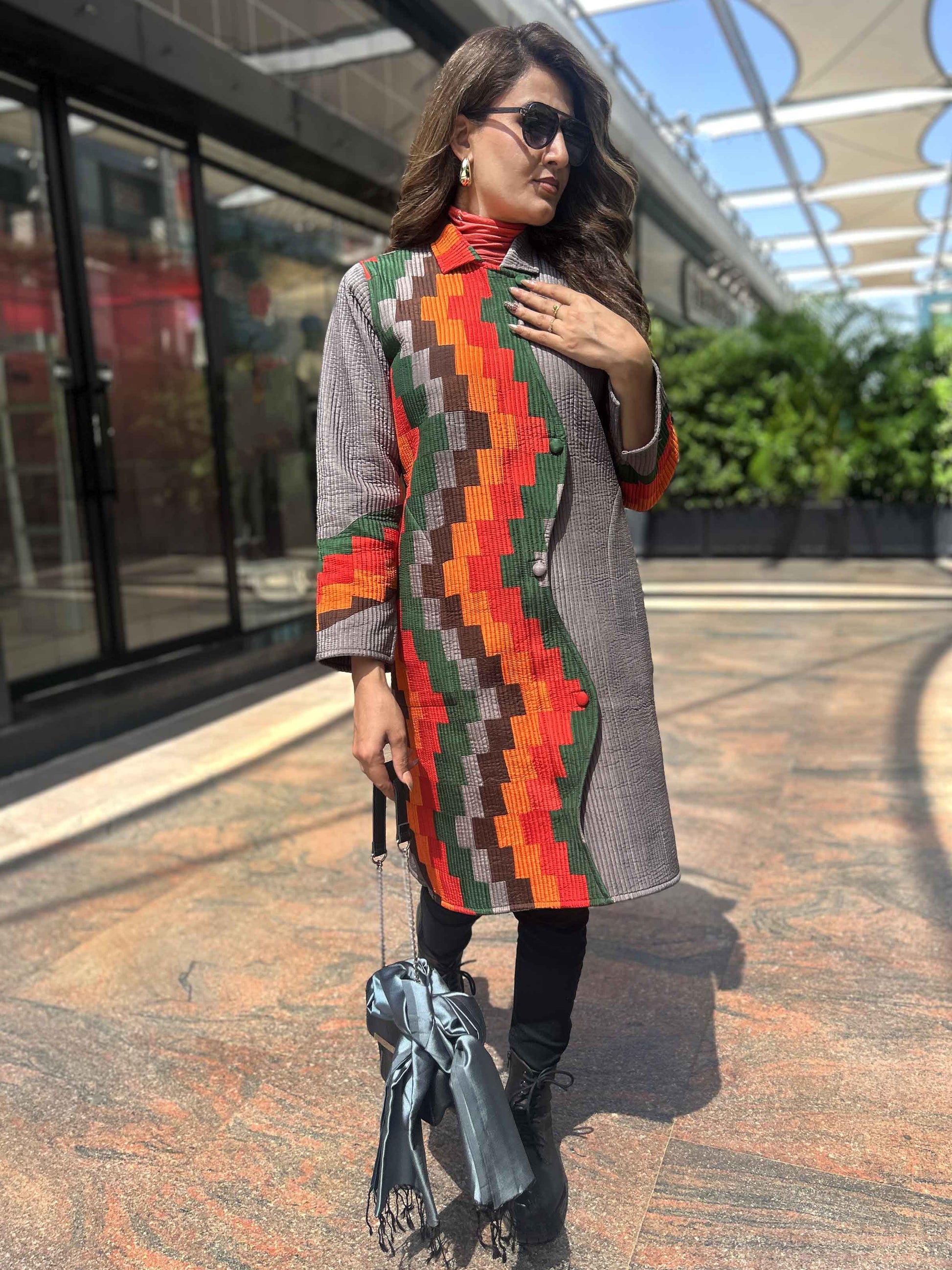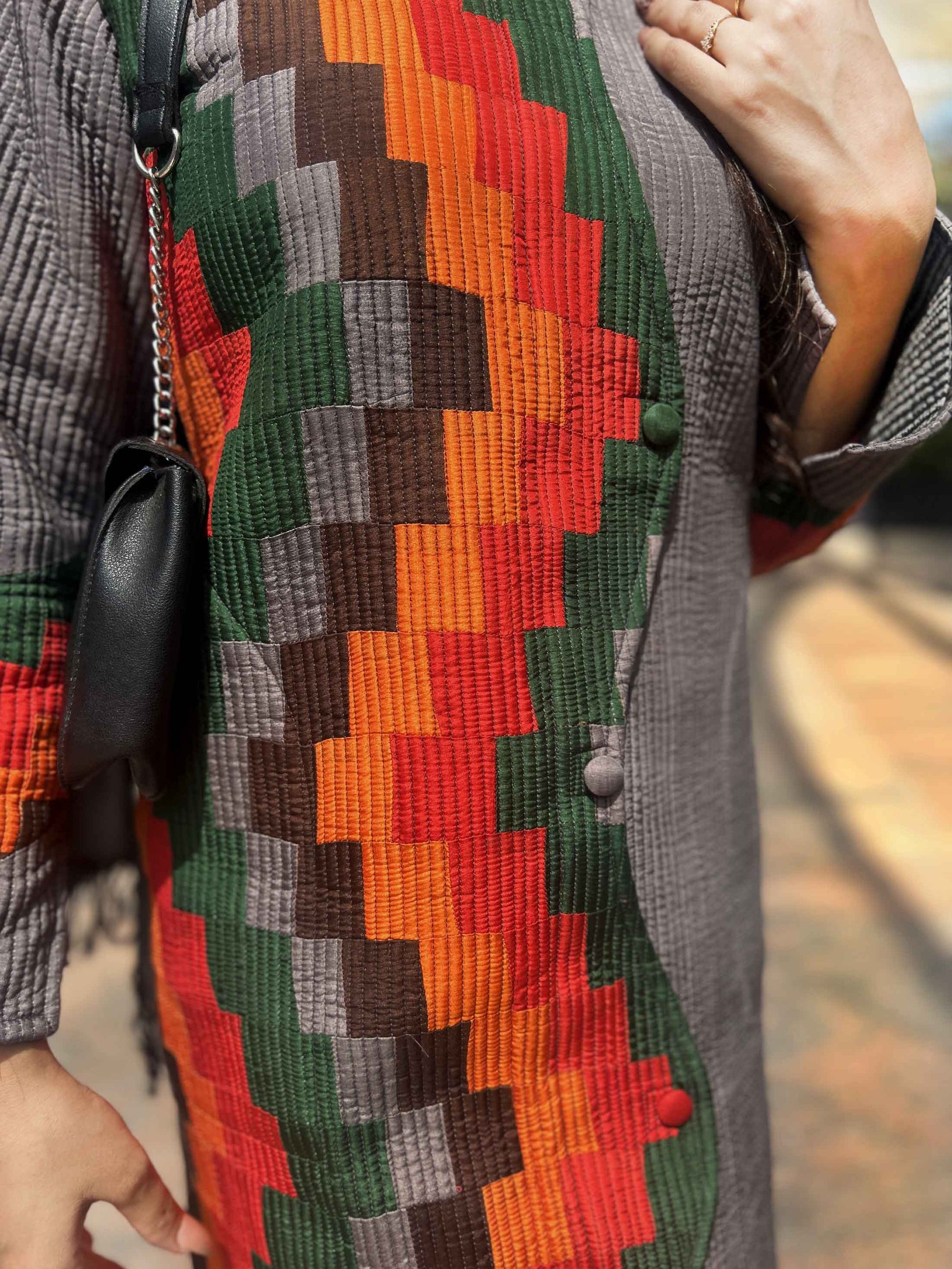 Part of the āVermont Autumn Collectionā, this quilted jacket made with patches of Pure Silk is inspired by Aztec designs. The patchwork is very intricate and is made in fall colors seen everywhere in nature.