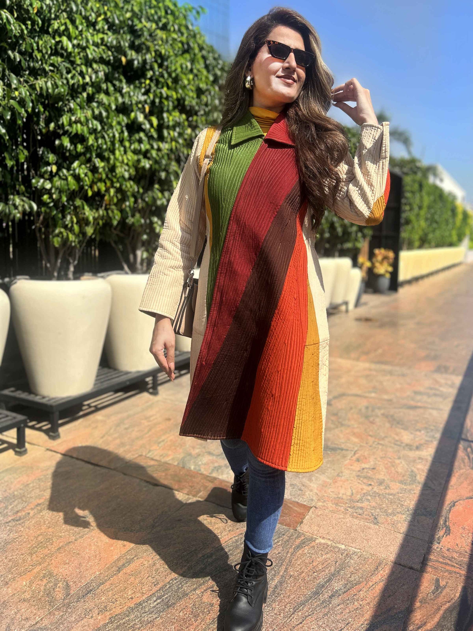 Part of the āVermont Autumn Collectionā, this quilted jacket made with patches of Pure Silk stitched in an interesting oblique pattern. The patchwork is very intricate and is made in fall colors ā beige, yellow, orange, green, bronze and red.