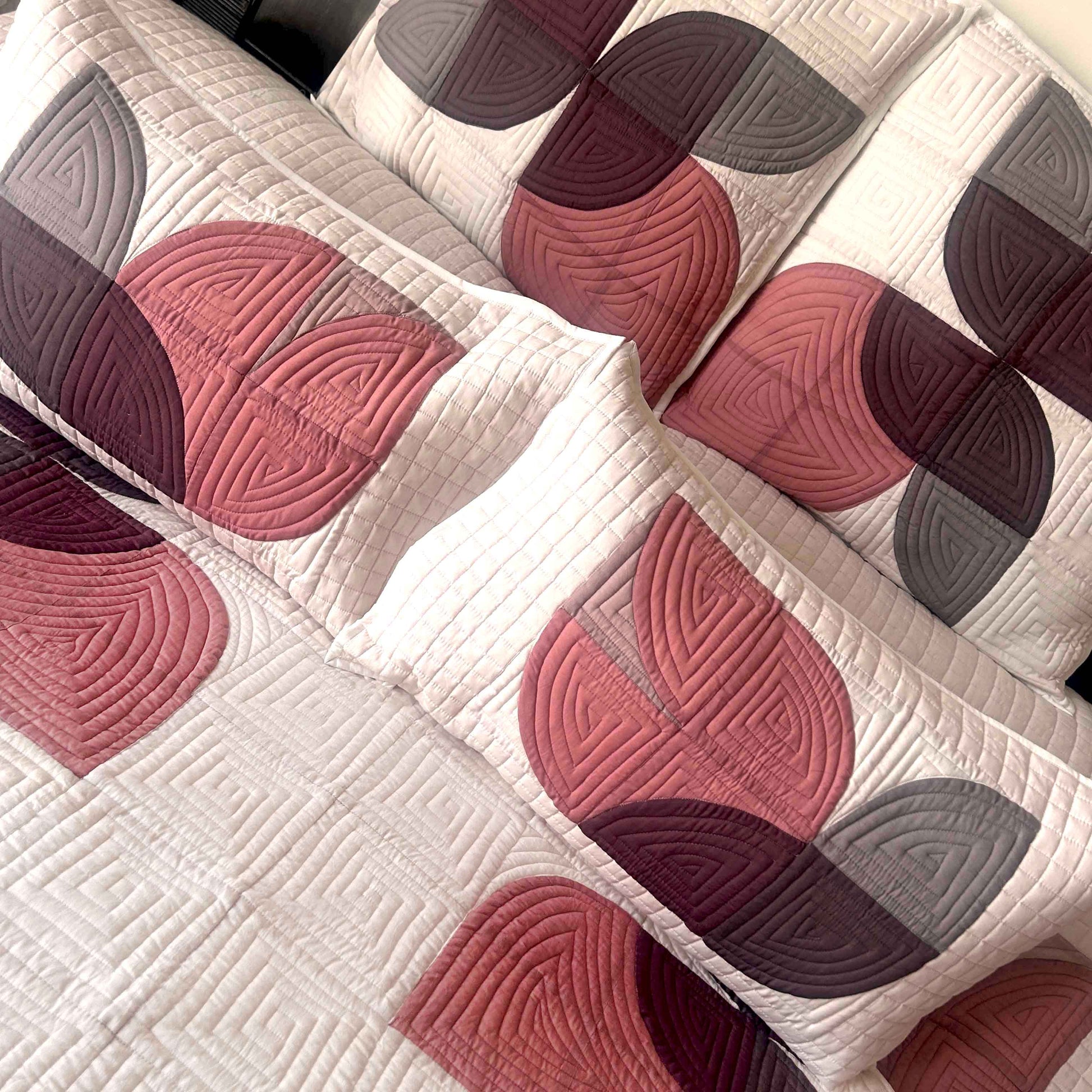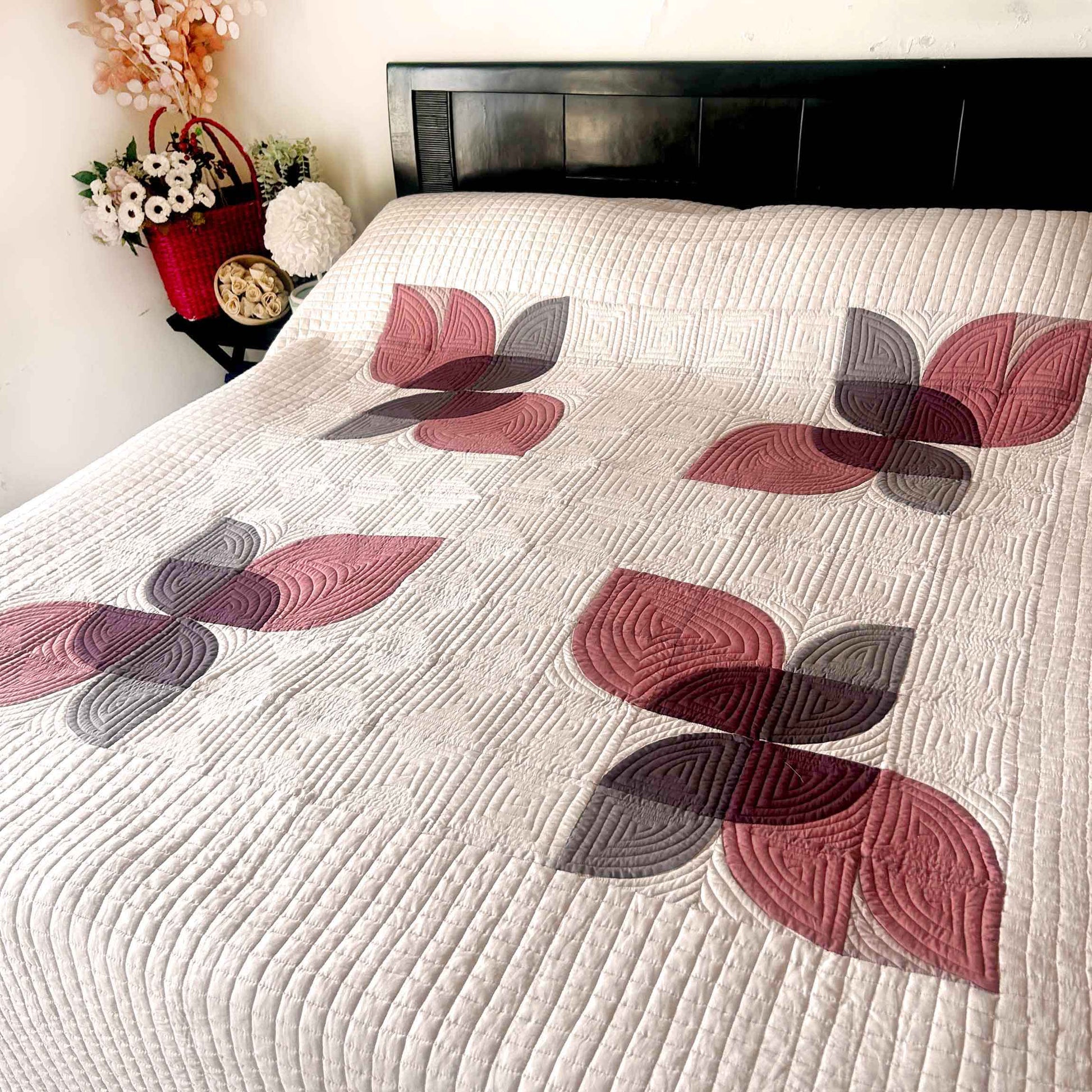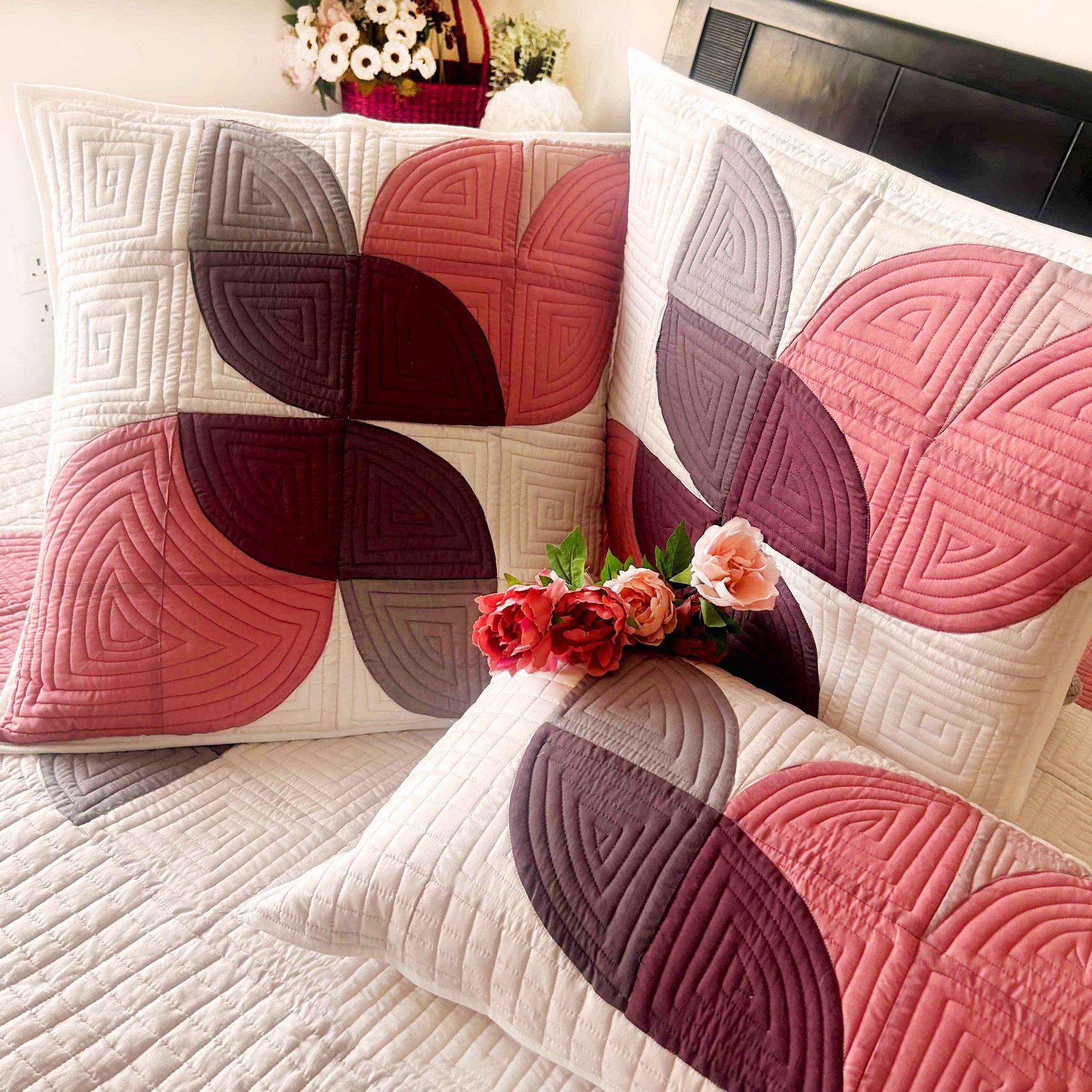 In these bedcover sets, we have used two types of patches - square and a square with a diagonal arc to create shapes resembling tulips. The resulting piece is an artistic rendition of a tulip garden. Made with super-soft pure cotton fabric, these quilted bedcover sets are pieces of art rightfully belonging to your bedroom.