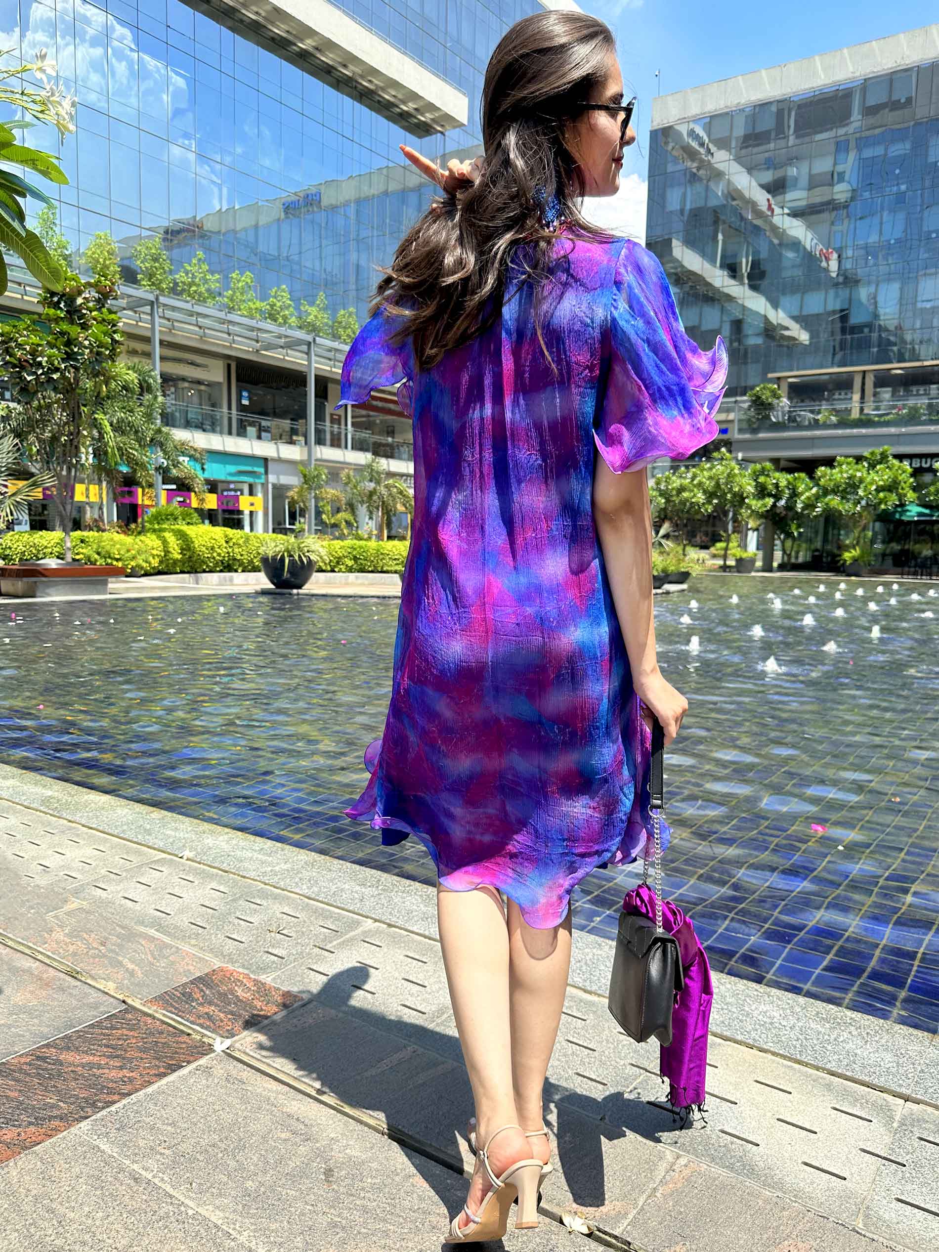 Parisian Passion Collection - A dreamlike perfusion of brilliant colors hand-dyed with a special technique on Pure French Chiffon of excellent quality. Each piece is unique, made by transferring colors from up-cycled Pure Silk sarees to Pure Silk French Chiffon with the application of steam. The cuts are sophisticated and charming, exuding the unmissable Parisian style.