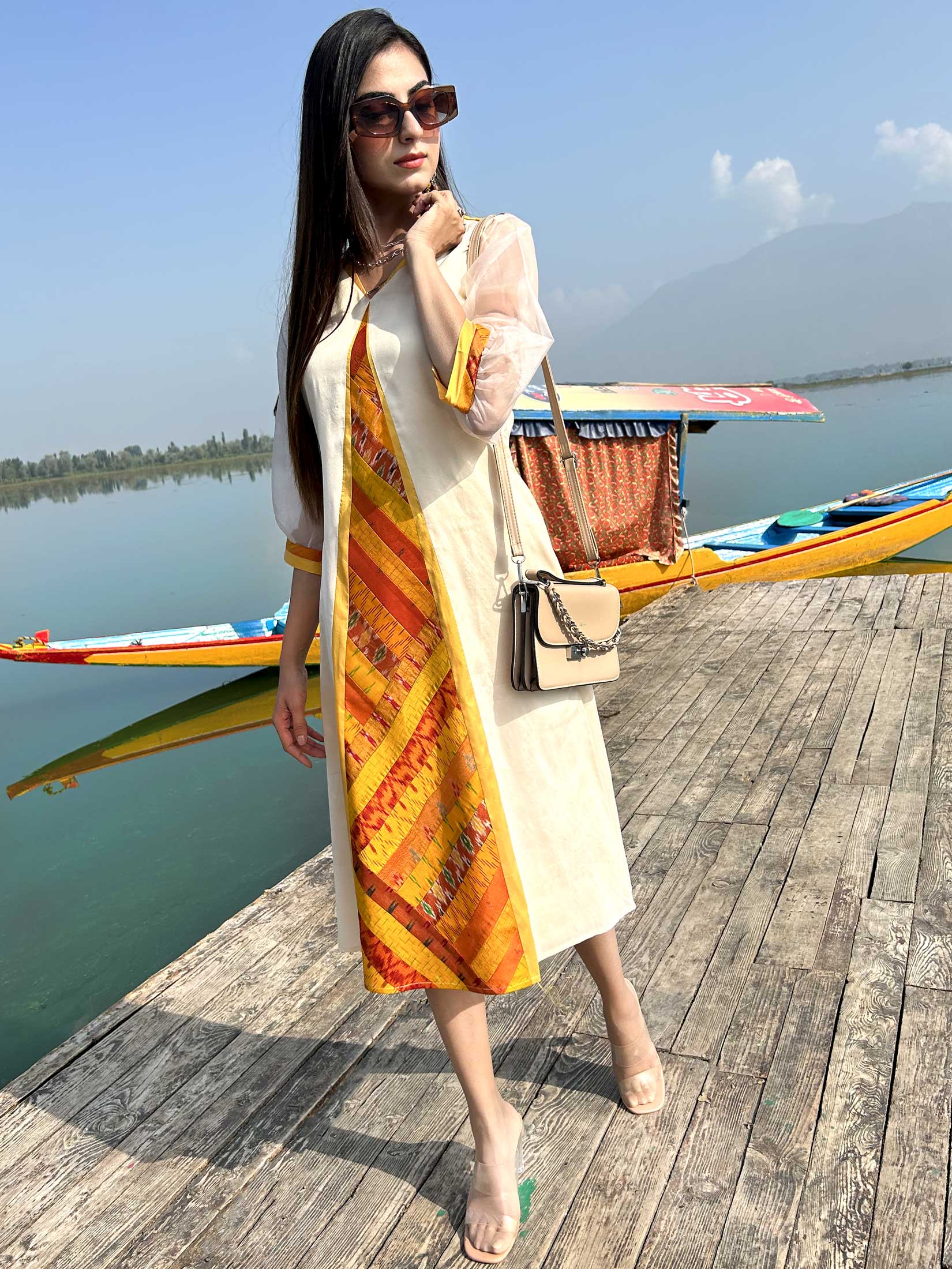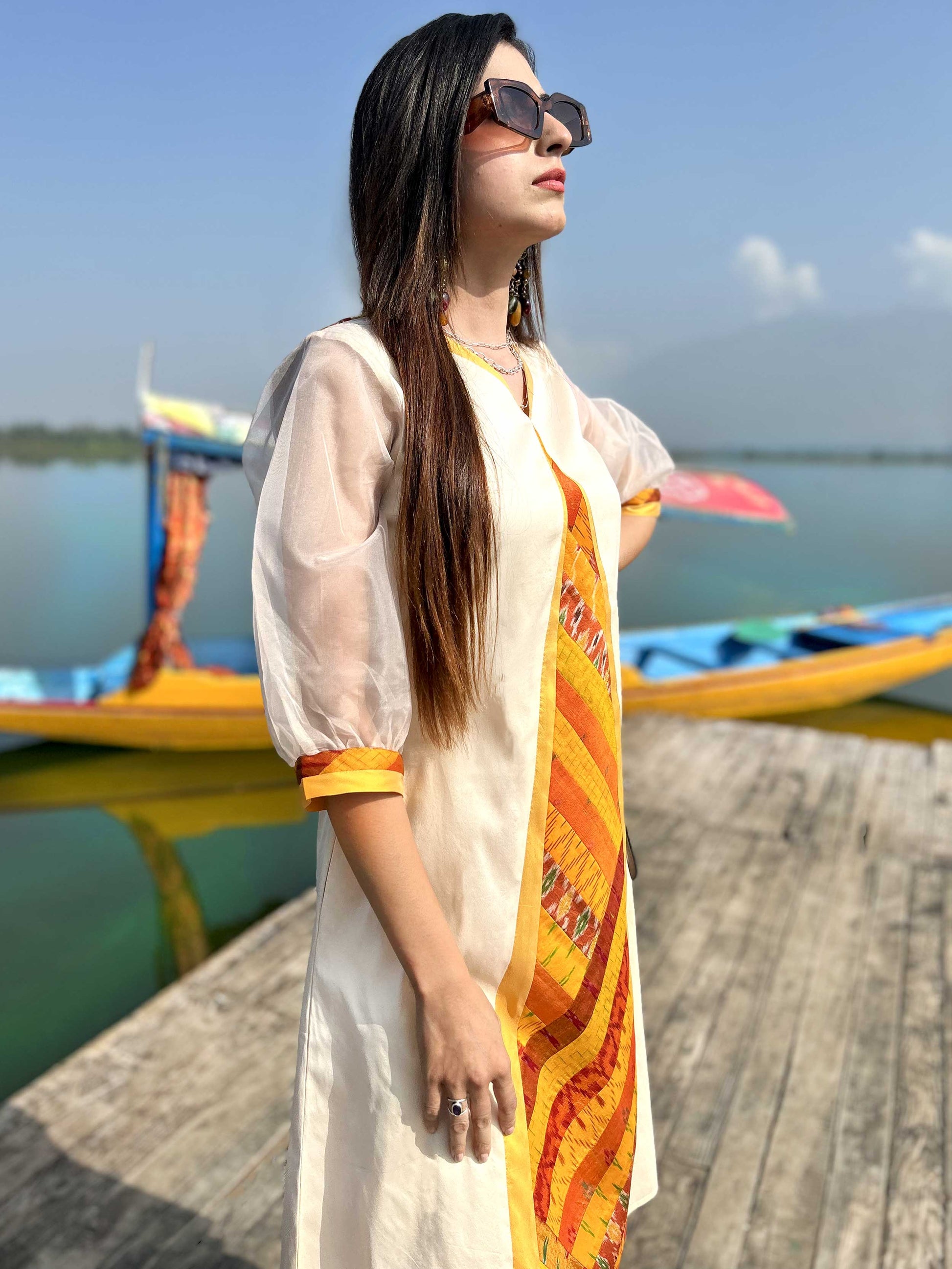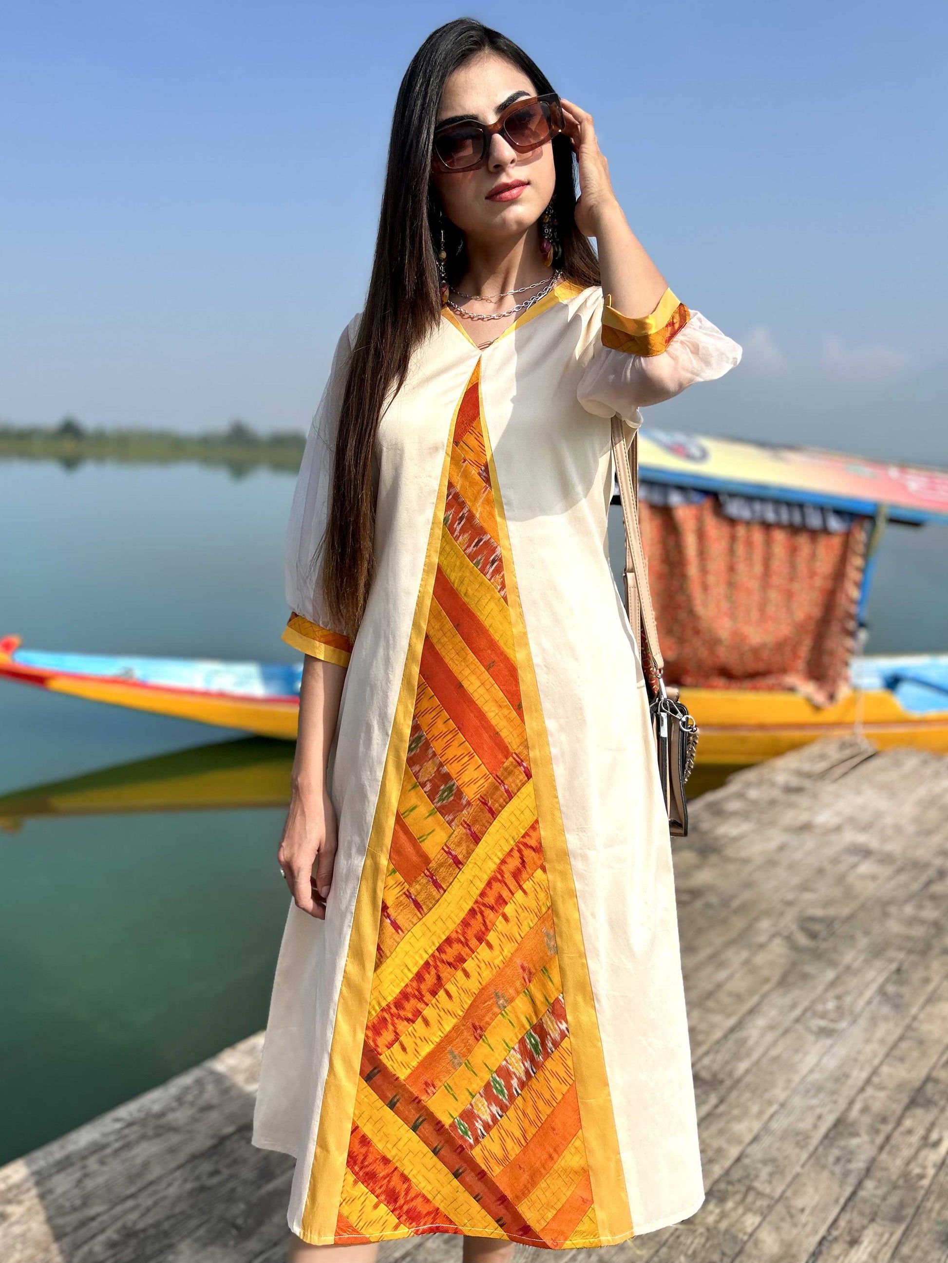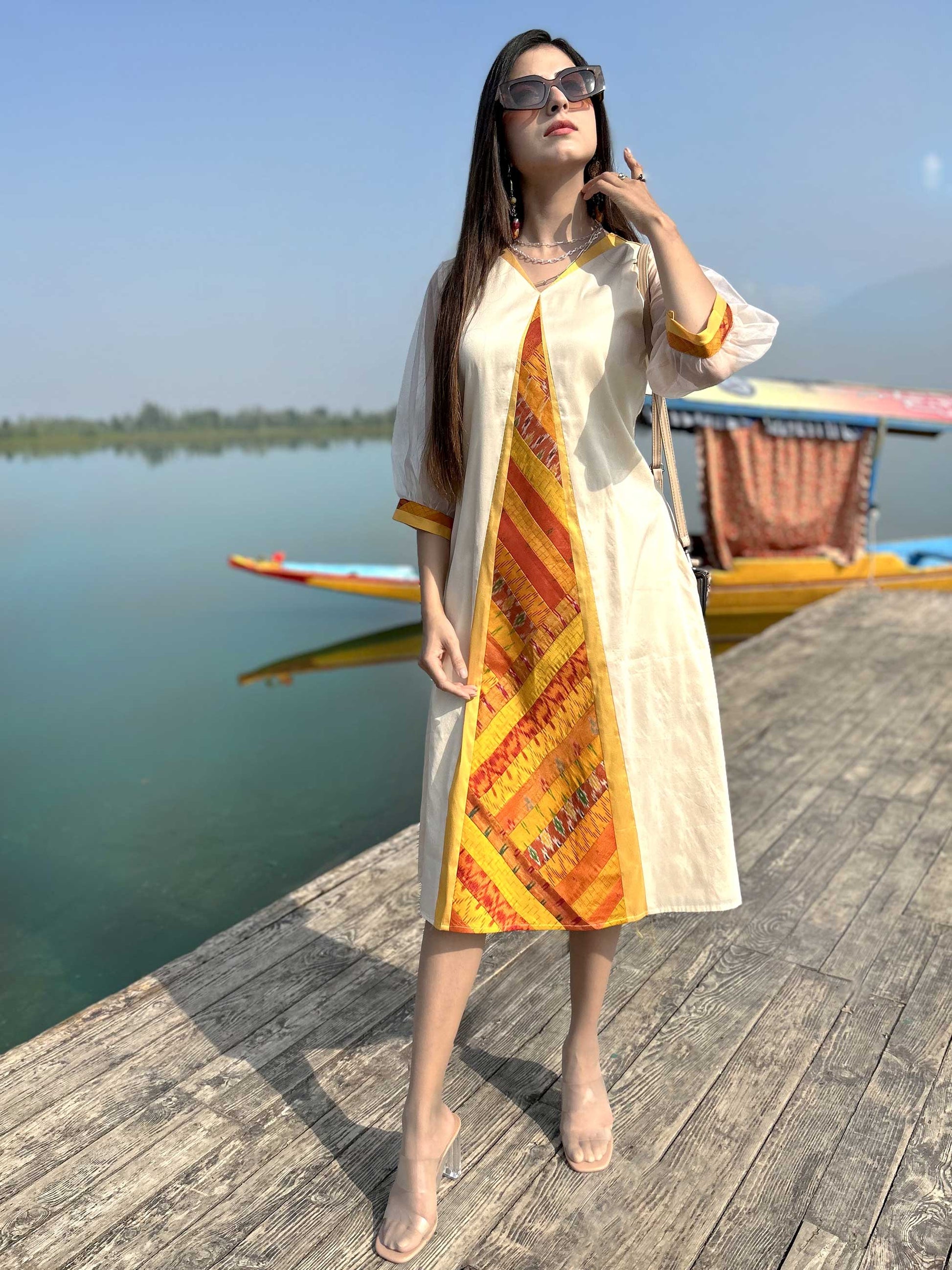 Our Gorgeous Kashmir collection is inspired by the charming beauty of Kashmir. The colourful Patola Silk Patchwork Dresses in this collection use patchwork constructed in intricate geometrical shapes and are inspired by the flora and fauna of Kashmir Valley.