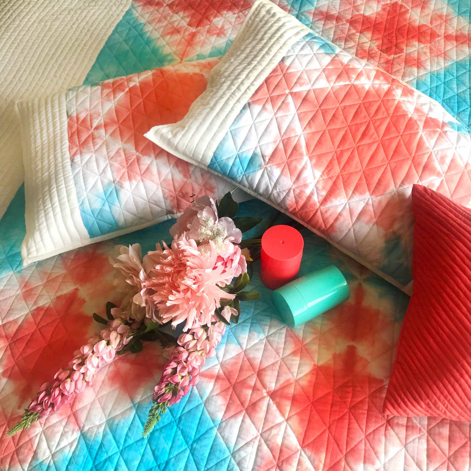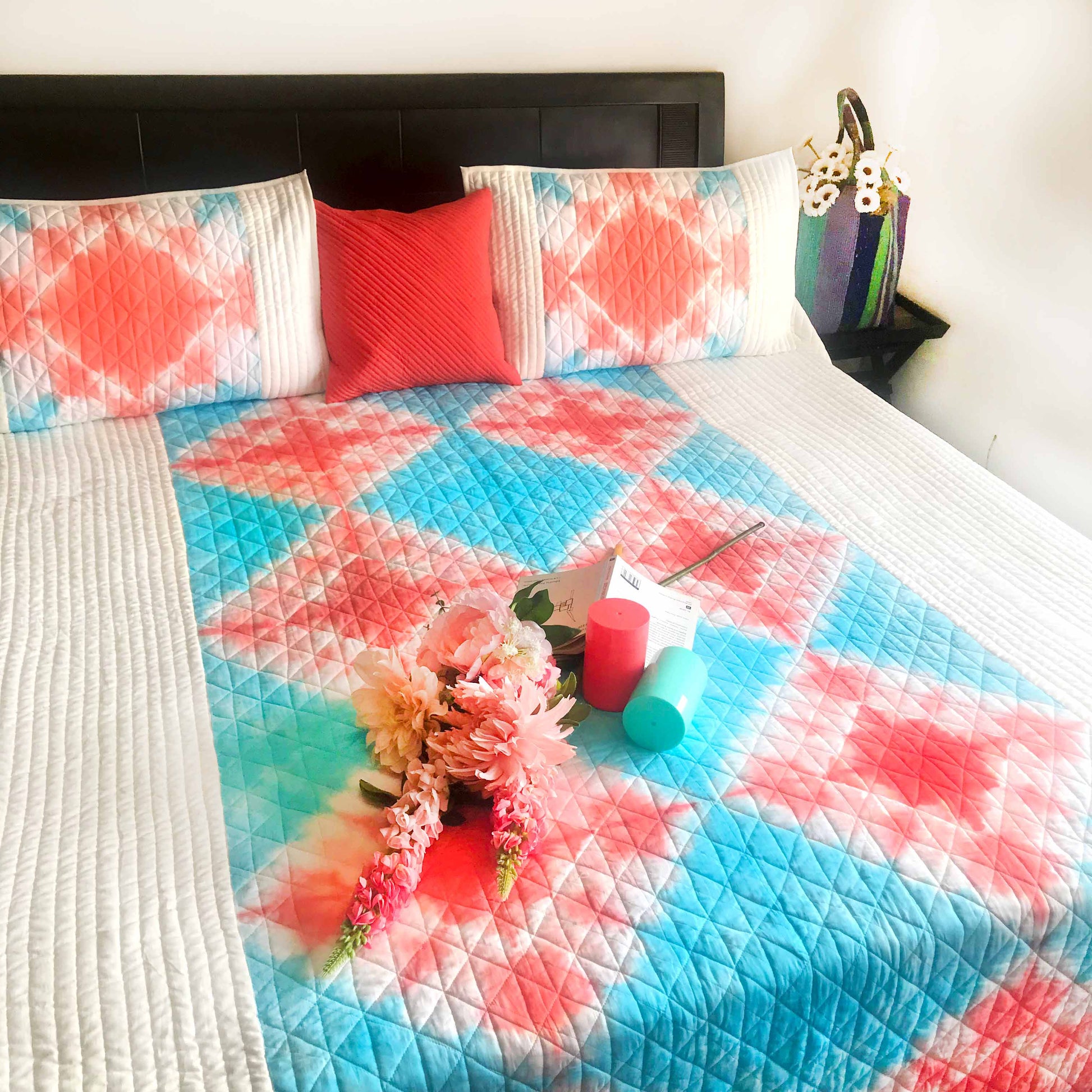 At Karmadori, we love our Bed Spreads. A chic modern take on Itajime Japanese Shibori, and made from very good quality pure Cotton, this vibrant Quilted Bed Cover Set is a part of our 'Love Always' Collection and is your perfect highlight for the bedroom. This Bedcover Set consists of a Reversible Quilted Bed Cover, two Quilted Pillowcases and a Quilted Cushion Cover in silk.