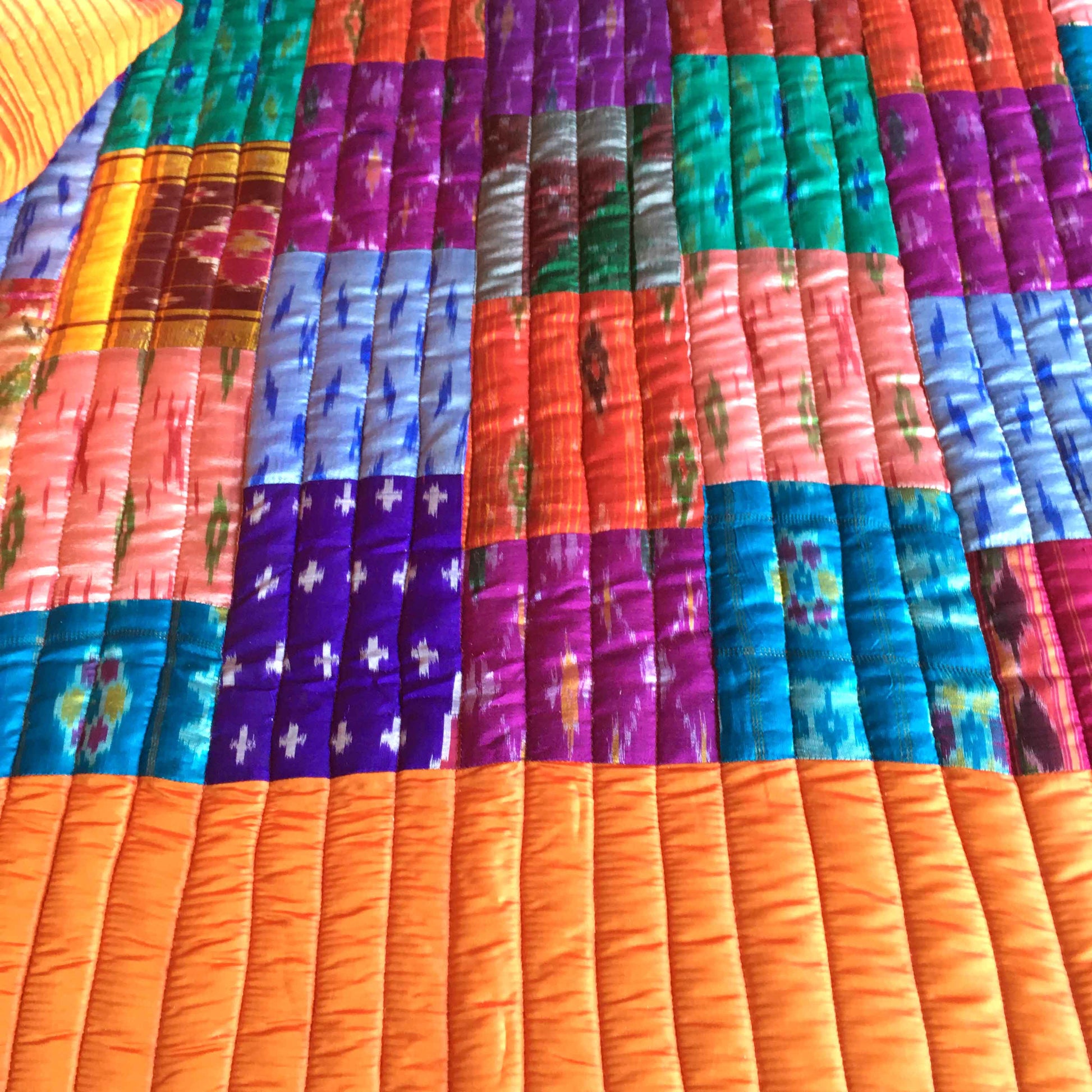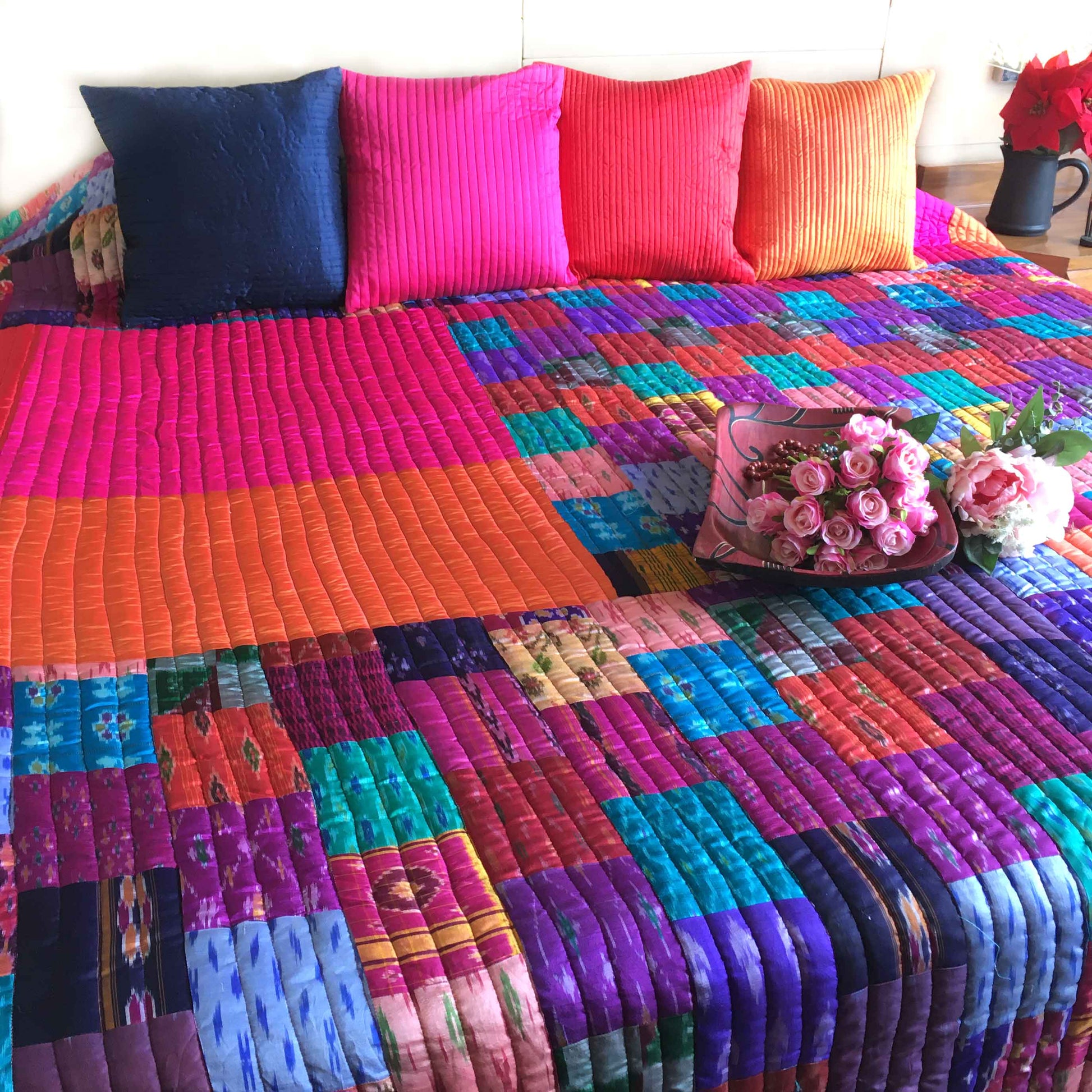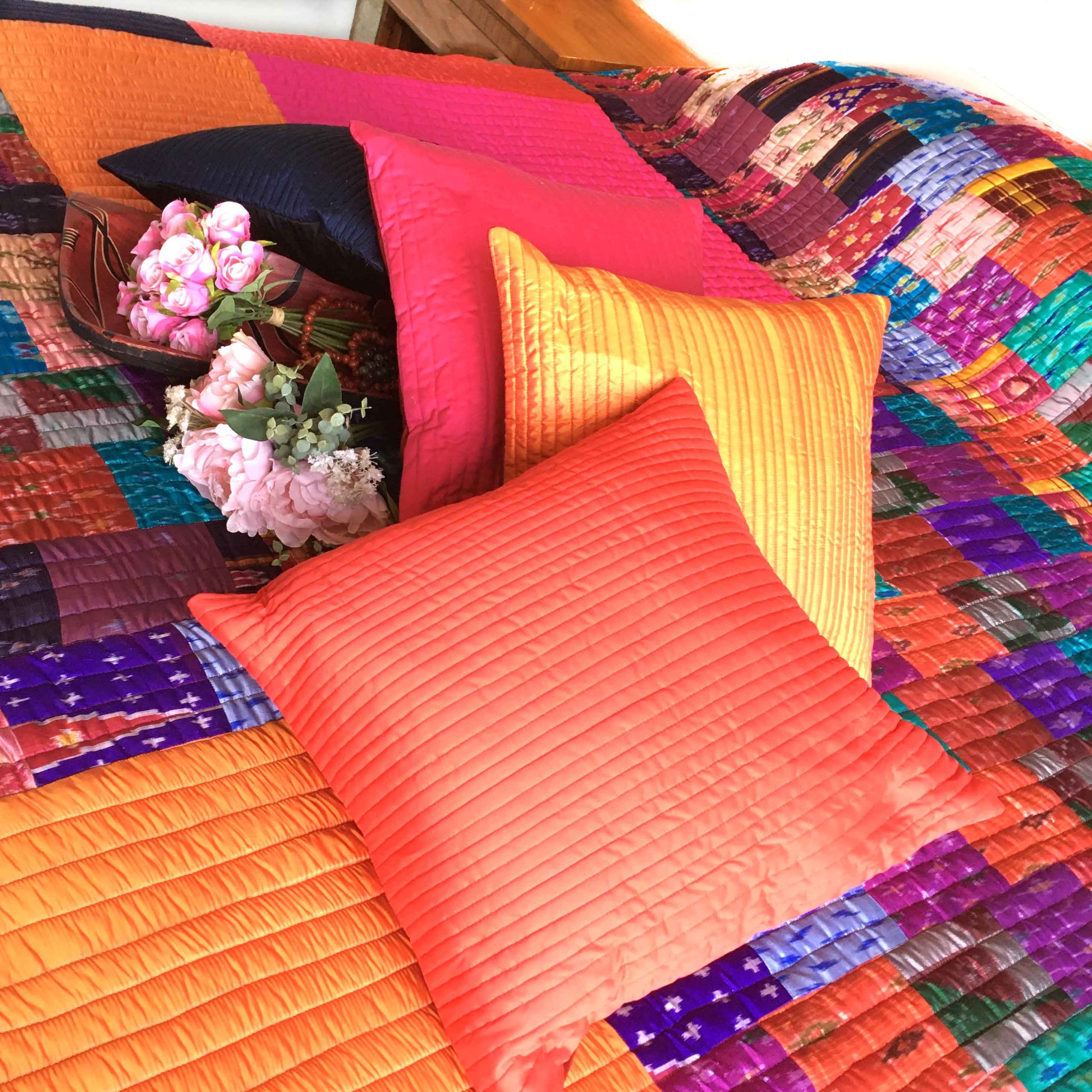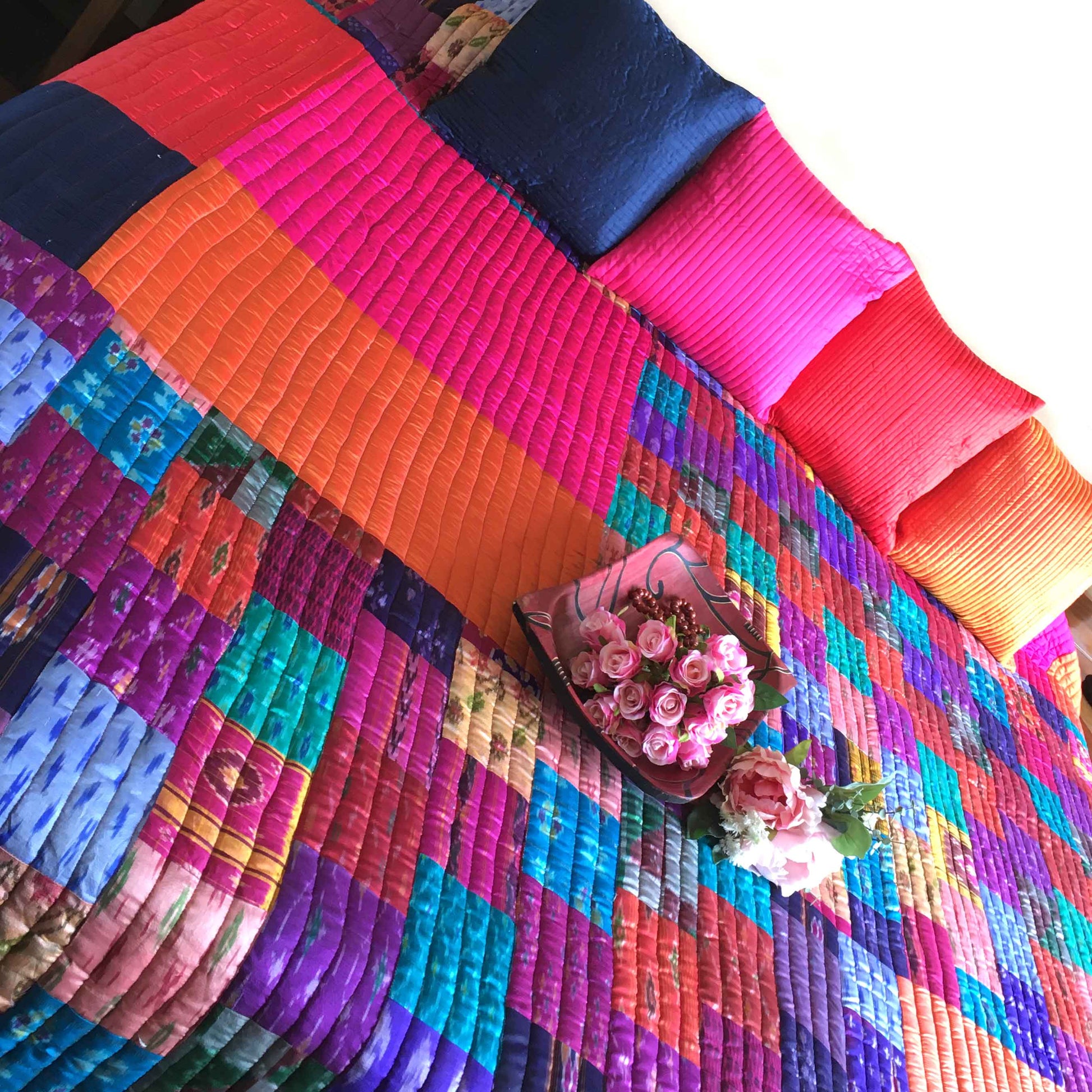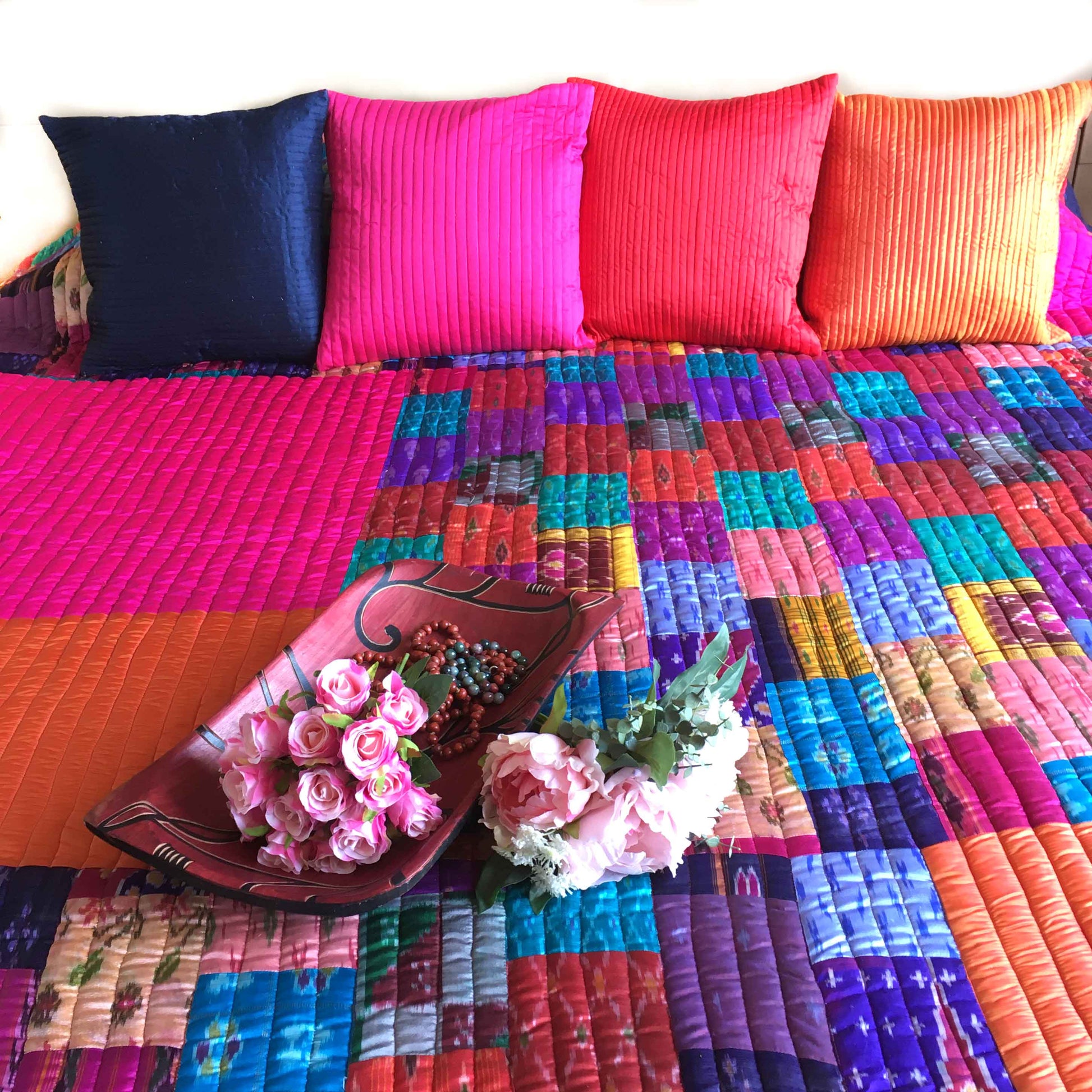 At Karmadori, we love our Handcrafted Bedcovers. Painstakingly handcrafted, this Patola Silk Quilted Bedcover is created with 100s of super soft Patola Silk Patches mixed with colorful Taffeta Silk patches in geometrical shapes and quilted in intricate designs.
