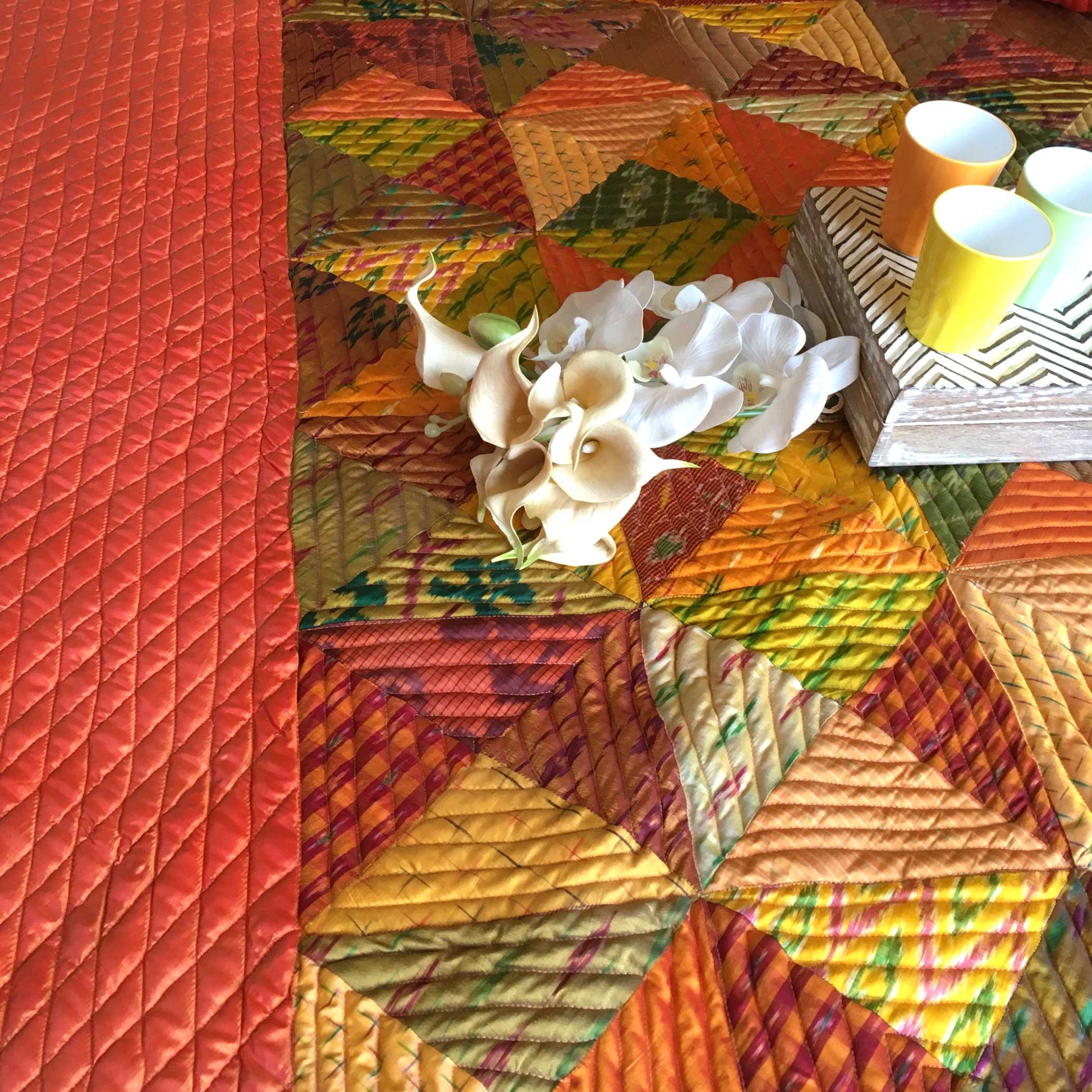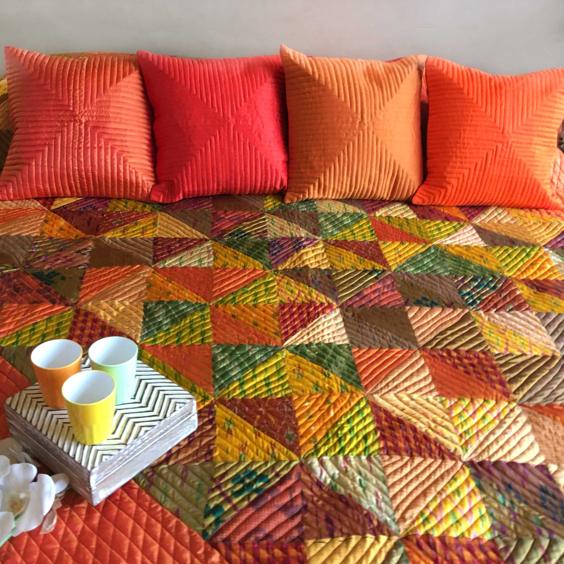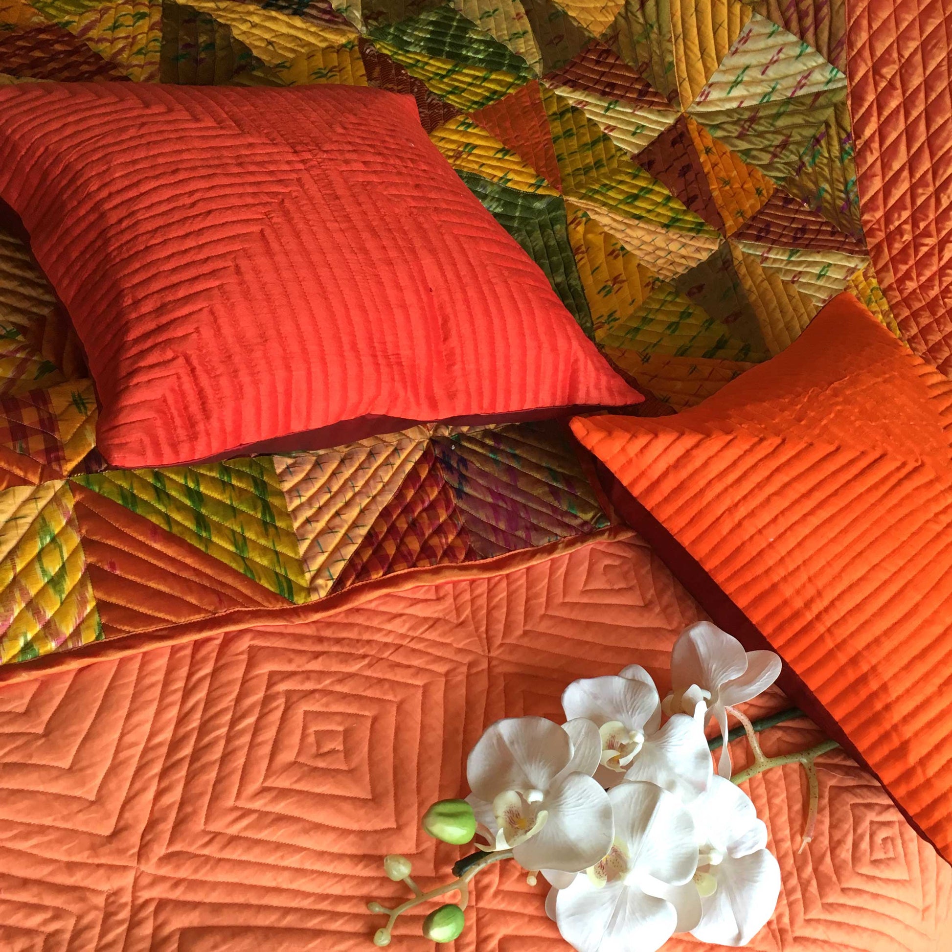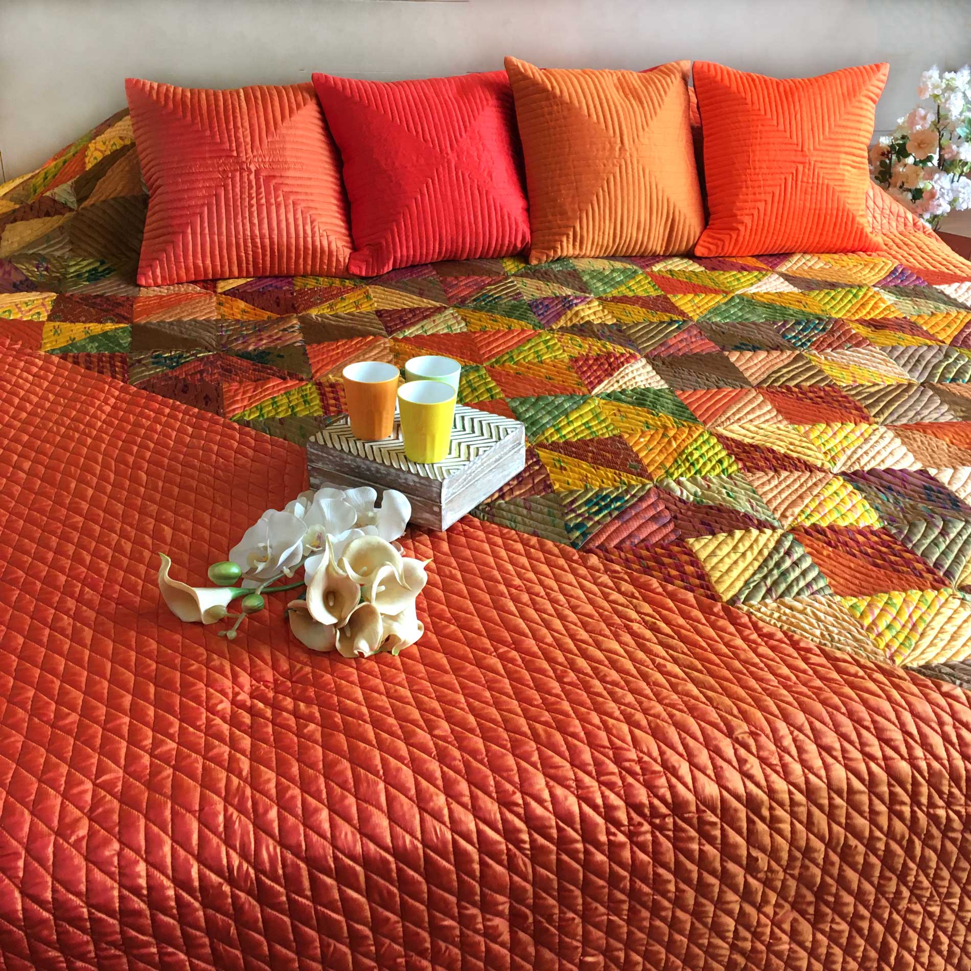 At Karmadori, we love our Handcrafted Bedcovers. Painstakingly handcrafted, this Patola Silk Quilted Bedcover is created with 100s of super soft Patola Silk Patches mixed with colorful Taffeta Silk patches in geometrical shapes and quilted in intricate designs.