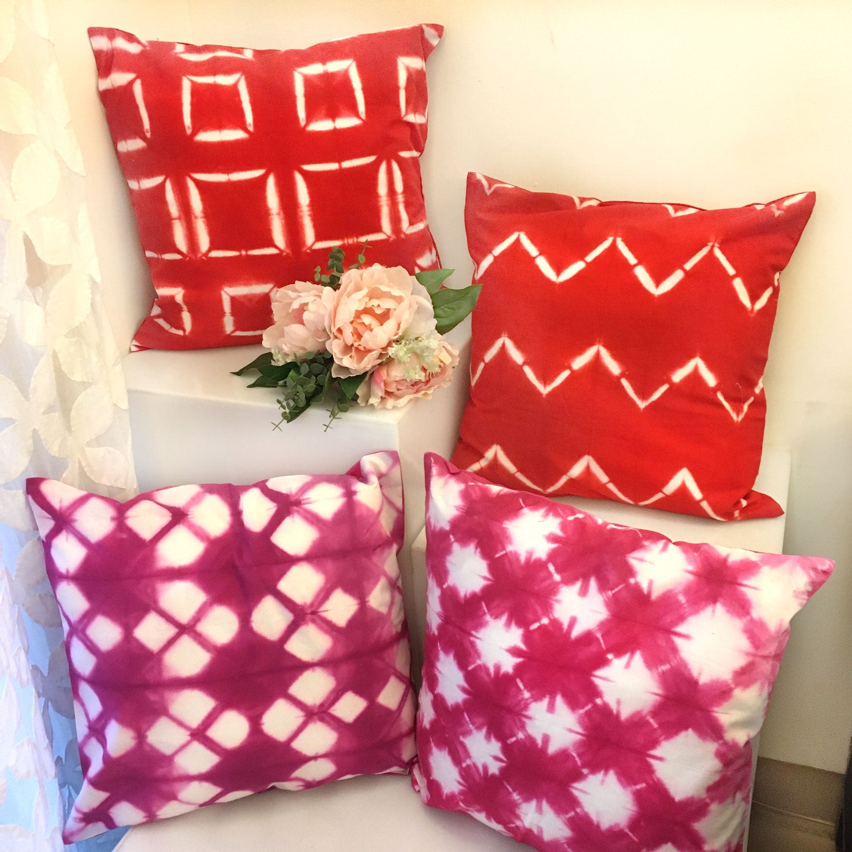Shibori is a Japanese dyeing technique that typically involves folding, twisting or bunching cloth and binding it, then dyeing it in mesmerizing colours. Shibori is a very vast technique and there are many ways to create truly infinite number of patterns. In order to create this beautiful cushion cover set of four, we have used wooden blocks, wooden bars and rubber bands to bind and resist the fabric for dyeing. Every piece is this set unique.