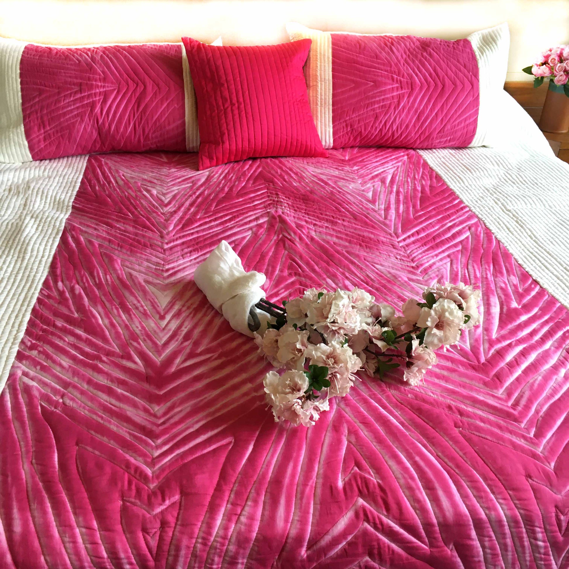 At Karmadori, we love our Bed Spreads. A chic modern take on Itajime Japanese Shibori, and made from very good quality pure Cotton, this vibrant Quilted Bed Cover Set is a part of our 'Love Always' Collection and is your perfect highlight for the bedroom. This Bedcover Set consists of a Reversible Quilted Bed Cover, two Quilted Pillowcases and a Quilted Cushion Cover in silk.