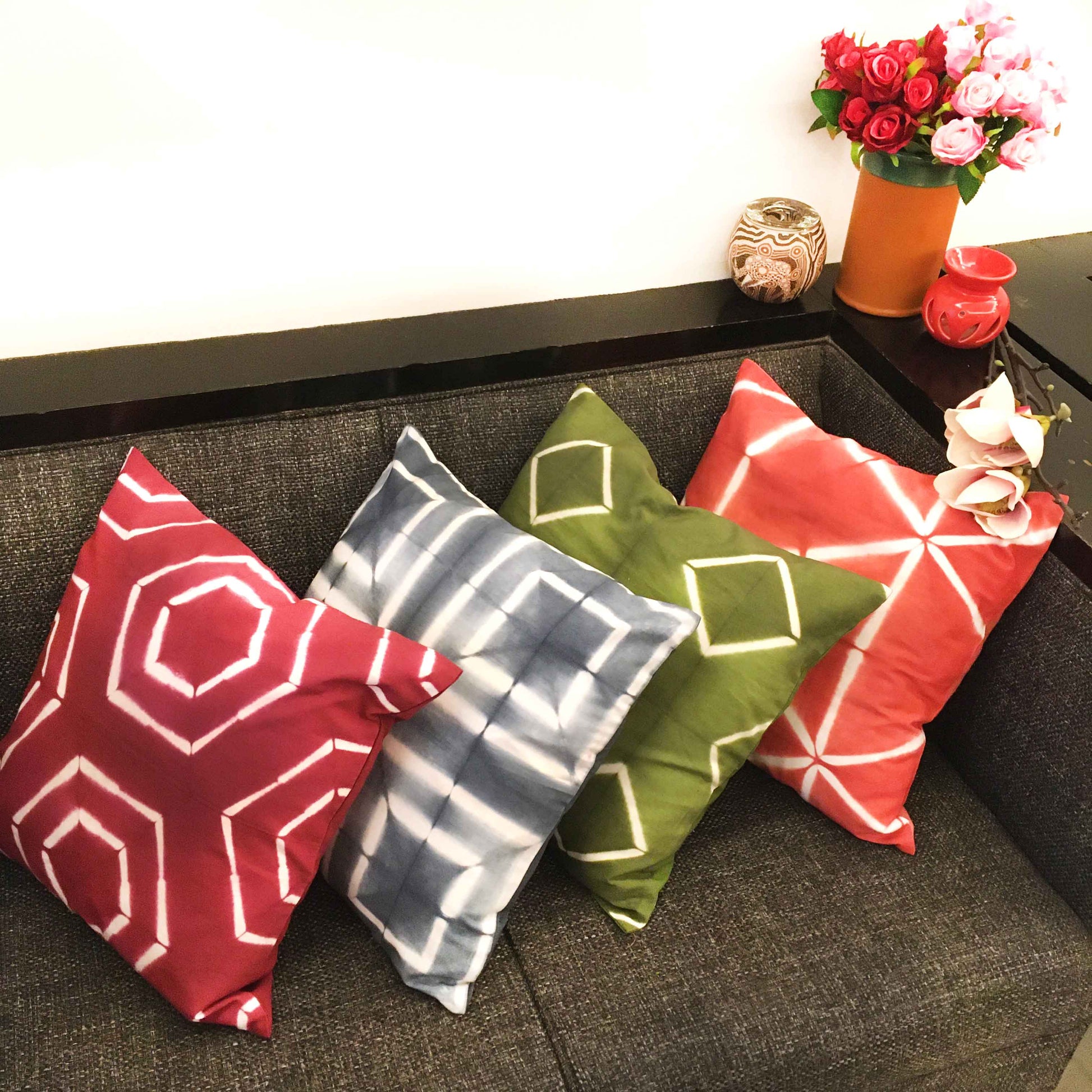 Shibori is a Japanese dyeing technique that typically involves folding, twisting or bunching cloth and binding it, then dyeing it in mesmerizing colours. Shibori is a very vast technique and there are many ways to create truly infinite number of patterns. In order to create this beautiful cushion cover set of four, we have used wooden bars and rubber bands to bind and resist the fabric for dyeing. Every piece is this set unique.