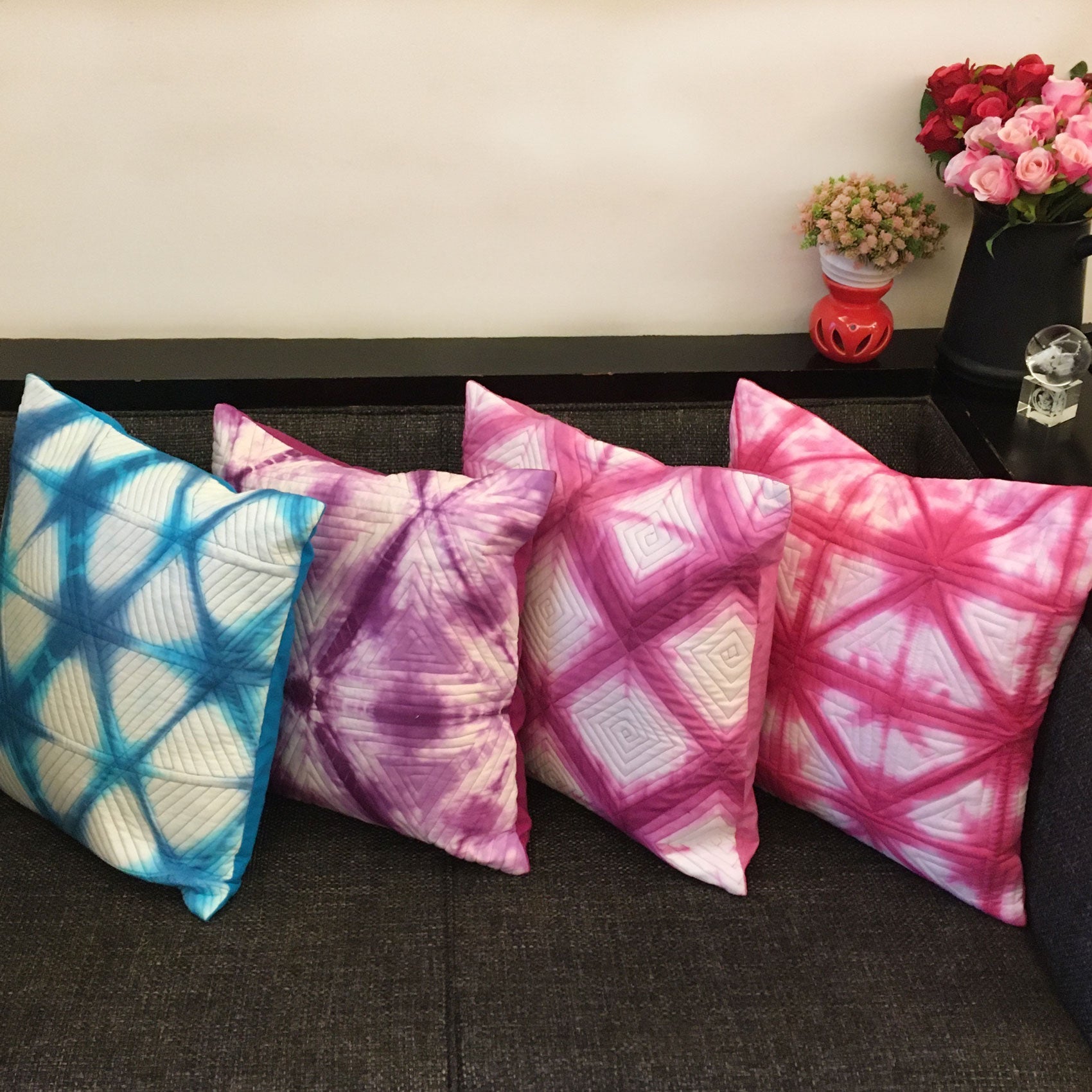 Shibori is a Japanese dyeing technique that typically involves folding, twisting or bunching cloth and binding it, then dyeing it in mesmerizing colours. Shibori is a very vast technique and there are many ways to create truly infinite number of patterns. In order to create this beautiful cushion cover set of four, we have folded the fabric in complex patterns and then dyed the edges in bright colors. Every piece is this set unique.